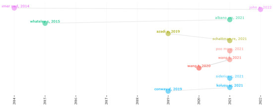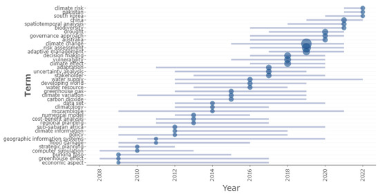Figure 6 provides an overview of the trends in literature per year from 2008 to 2022. In 2012, trending topics included policy integration, climate information, and sub-Saharan Africa. In 2019, trending topics were focused on adaptive management, risk assessment, and climate change as shown in the cluster with larger circles in blue. Thus, a larger circle represents more authors are focused on those trending topics. In 2022, trended topics include climate risk. By using the nature of the cluster in terms of cluster size, it can be deduced that climate change, risk assessment, and adaptive management were the trending terms in 2019. Comparatively, this cluster size is bigger than others. Meanwhile, climate risk was trending in 2022, suggesting a growing research interest possibly because of the likelihood that it could threaten human lives when not given the needed attention. Contrarily, adaptation strategies trended more heavily in 2017 than in 2022, which suggests that adaptation strategy needs to be intensified to help manage climate risk impact in general.