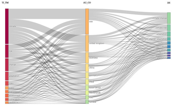 Figure 7 shows a Three-fold plot specific to Topics (TI_TM), author country (AU_CO), and keywords in the top 10 rankings. The top 10 topics (climate, risk, change, adaptation, and many more) are associated with the top 10 authors from the USA, United Kingdom, Australia, Germany, China, India, South Africa, Netherlands, Italy, and Canada. South Africa is the only SADC member in this rank. Again, the top 10 keywords from these AU_CO are climate change, climate risk, adaptation, resilience, etc.