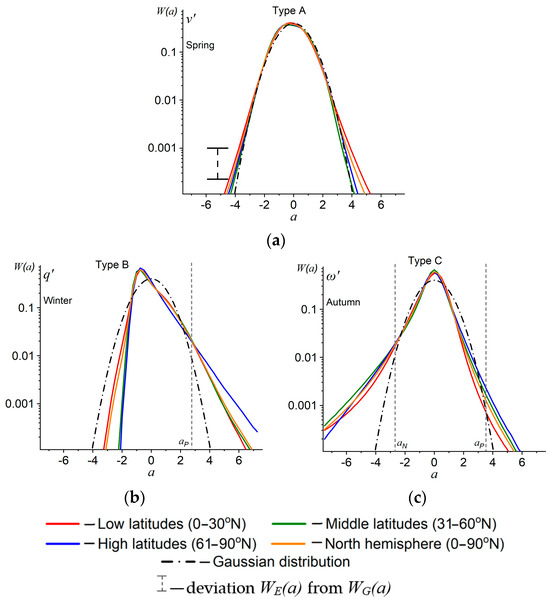 The third Type C, where the WE(a) values exceed the WG(a) values both in the positive and negative areas, can presumably describe the horizontal (meridional) and vertical wind speed components for TS (21–33% in the middle troposphere). For a synoptic time scale, Type C characterizes the convective transfer of heat and moisture (57–63%). It should be noted that the most common type of empirical PDF for anomalies for TS is Type B, and for SV, it is Type C, which is probably due to the predominant contribution of q′ and t′ anomalies to the total number of anomalies. Thus, we can observe the changes in the PDF types for these anomalies after filtering the initial time series.
