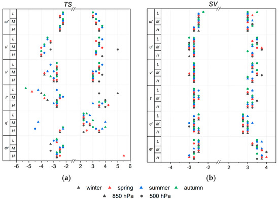 Then, we derived time series of the following meteorological parameter anomalies from the initial time series (TS) and from the time series of synoptic variability (SV): air temperature (t′), specific air humidity (q′), wind speed components (zonal—u′, meridional—v′ and vertical—ω′) and geopotential (Φ′). Specific humidity is the mass of water vapour per kilogram of moist air (kg/kg). The total mass of moist air is the sum of the dry air, water vapour, cloud liquid, cloud ice, rain and falling snow (https://codes.ecmwf.int/grib/param-db/?id=133 (accessed on 1 January 2024)).