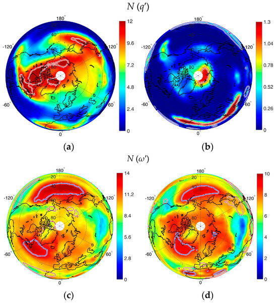 Spatial variability of N for TS at 850 hPa in winter (a,c) and in summer (b,d) over the period of 1979–2018. Red dash line—, blue dash line— (specified by 0.95 quantile).