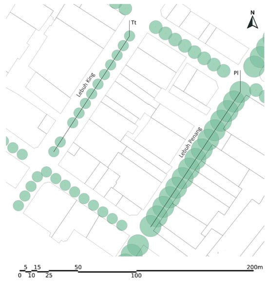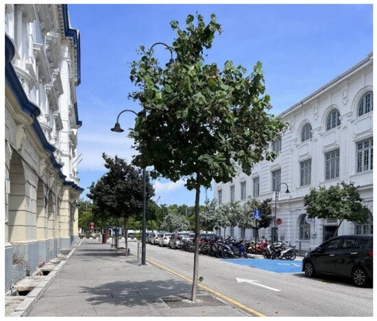 Gat Lebuh China (Figure 5 and Figure 6) currently has three rows of trees: two on the sidewalks and one in the center, in between the directions of travel. On the sidewalks, the species Talipariti tiliaceum, having the common name of sea hibiscus in Malaysia, was planted. This medium-sized, round-shaped tree species has low sensitivity to climate impacts, as evaluated in the research [2] and documented on the ACresT website [51]. In the center, two tree species are planted, Conocarpus erectus, commonly known in Malaysia as buttonwood, and Pterocarpus indicus, commonly known as angsana tree. The first is a medium-sized, round-shaped tree, planted in most of the street section. This species’ climate resilience is unknown. The second species is a large, dome-shaped tree, located only in the intersections with other trees, where a wider planter was introduced. Pterocarpus indicus has intermediate sensitivity to climate impacts, as evaluated in the research and documented on the ACresT website. Two mature Pterocarpus indicus are pre-existing in the middle section of the street.