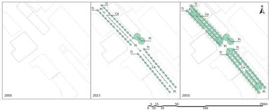 Tree-lined trees in Gat Lebuh China, George Town, Penang, 2000, 2023, and 2050. Ce: Conocarpus erectus; Pi: Pterocarpus indicus; Ti: Talipariti tiliaceum.