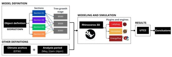 The first step consisted of the model definition, when the object definition for the simulations was carried out and its sections that can be used as case studies were defined. Once this definition was made, the tree growth stages, whose shading impacts can be evaluated, were selected.