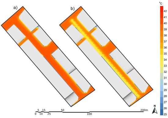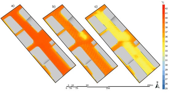 Additionally, the analysis of the data obtained from the spatial maps was summarized in Table 2, containing numerical comparisons of temperature reduction between the different time intervals, identifying the percentages of the area that had each temperature reduction for each one of the four scenarios simulated.