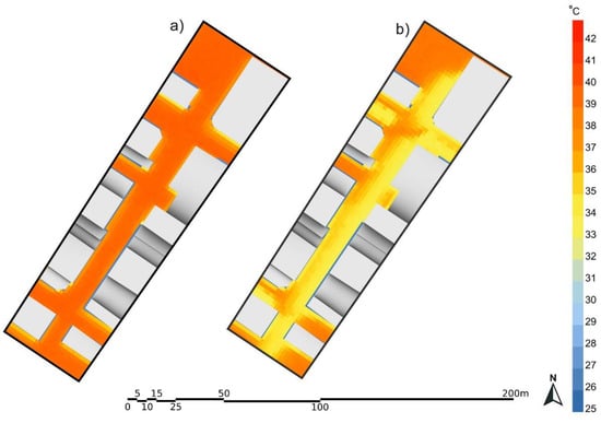 The results of the simulations of temperature reduction provided by the insertion of trees in the three different time frames—2000, 2023, and 2050—were exported in the form of a UTCI spatial map from the grid assembled with temperatures in °C, as can be seen in Figure 11, Figure 12, Figure 13, and Figure 14, which represent S01, S02, S03, and S04, respectively.