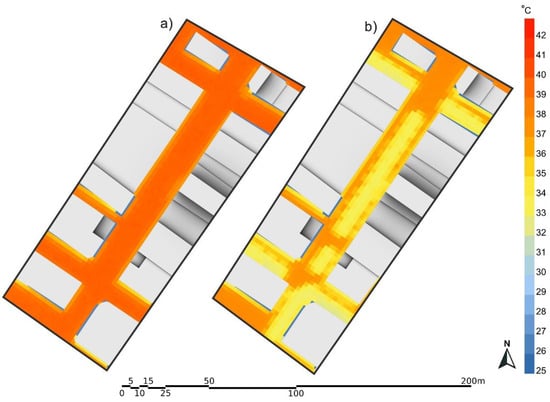 The minimum reduction, 3 °C, occurred on a NW–SE-oriented street with only one row of trees. The two streets with a SW–NE orientation were cooler by 1 °C before tree planting, achieving a 5 °C temperature reduction in 2050. These streets each have a single row of trees, but different species and sizes, with the bigger trees cooling a larger area but not substantially. The difference in size does not appear to have been reflected proportionally in terms of temperature reduction. Solar orientation proved to be of consequence: one single row of trees was more impactful in terms of temperature reduction in the cases of SW–NE orientation than in the NW–SE orientation. Solar orientation, the number of tree rows, and their distribution all influence the effectiveness of temperature reduction.
