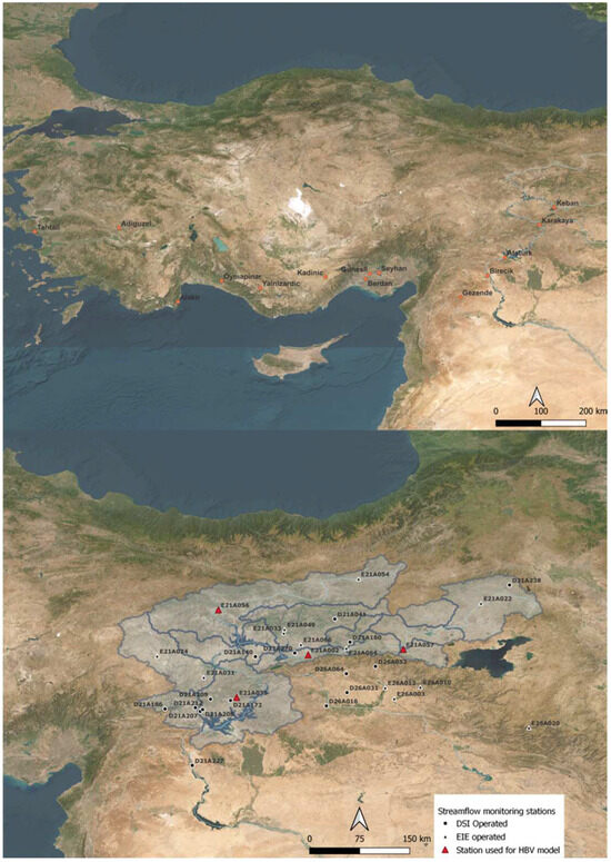 Hydropower is a crucial renewable energy source in Turkey, particularly given the nation’s expanding energy requirements and the significant hydroelectric potential within its river basins. Effective management of water storage reservoirs, such as those in the Euphrates–Tigris Basin (ETRB), is essential for optimizing hydropower production and ensuring water availability. This necessity becomes even more pressing in the context of climate change, which poses challenges through altered precipitation patterns and increased frequency of extreme weather events. It is widely acknowledged that managing water storage reservoirs is essential for fostering adaptability and resilience in the face of the numerous obstacles that climate change and its effects present. These facilities serve multiple purposes, such as mitigating flood damage and providing water during dry spells. Depending on how they are built and used, basins can support a wide range of ecosystem services, help produce energy, and guarantee a consistent supply of water under less extreme conditions [1,2]. For instance, streamflow variations, forecast uncertainty, and storage capacity restrictions are frequently considered when optimizing the delivery of water [3]. As a result, numerous models have sought to estimate the best release scenarios while taking the context of the difficulties encountered and climate projections into account. Peng and Buras presented a computational procedure for multi-reservoir systems, considering water budget and cumulative mass curves to account for both controlled and unregulated flow [4]. Other methods, like extended deficit analysis, incorporated reservoir characteristics to explore storage–yield relationships with regard to available data on each studied dam. Research advancements are needed to improve the accuracy of estimation methods for streamflow release. Decision-support tools provide estimates of daily outflows from reservoirs and compare them with estimates of unaltered streamflow [5]. These tools help environmental managers understand the complex interactions between water withdrawals, reservoir operational practices, and aquatic habitats. They also identify physical and operational features of reservoirs that have a significant effect on reservoir outflows, such as the ratio of average withdrawals to average inflows and the size of the surface area relative to drainage area. In addition, D. Fishel studied the hydrology and water quality of Swatara Creek in Pennsylvania, which included analyzing concentrations of suspended sediment, nutrients, metals, and acid mine drainage in surface-water inflows and downstream discharge from a planned reservoir [6]. The study found that mine drainage affects water quality and can impair the planned uses for the reservoir unless measures are taken to improve water quality from both point and nonpoint sources. These studies highlight the importance of developing more accurate estimation methods for streamflow release to better manage water resources and preserve downstream ecosystems.