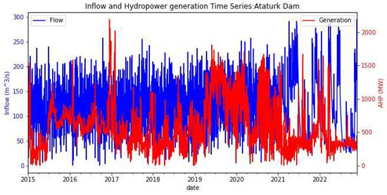 Figure 2 shows Ataturk Dam’s 8 year (2015–2022) inflow and generated hydropower data. As can be observed from the graph, the inflow and hydropower are correlated for most of the years; however, in 2017, which was one of the dryest periods for Turkey, the generated hydropower was more than the inflow. This occurrence can be due to the socio-political decisions regarding the energy production. Furthermore, from mid 2019 to the beginning of 2020, there was a significant increase in energy production when compared to the previous 2 years. This was most likely due to the uncontrolled immigration of refugees to the area during that time. With the unexpected increase of population, the energy consumption was high.