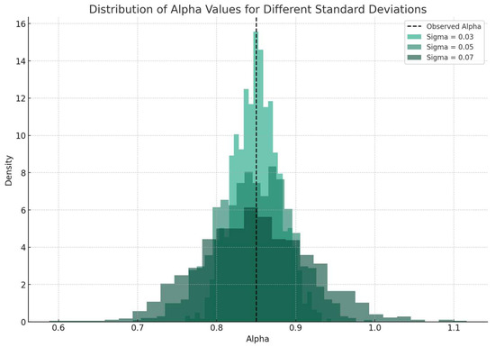 The distribution of alpha (α) values generated by varying the standard deviation (σ) of the random variable ε. Different σ values were used to assess the sensitivity of α to variations in ε. While only these three ranges are shown for clarity, a broader range from 0.01 to 1 with a 0.02 interval was generated. The normal (Gaussian) distribution was used for ε, providing a realistic simulation of uncertainties.