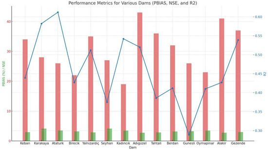 In Figure 5, the vertical axis represents the metric values, while the horizontal axis lists the individual dam names. The blue bars indicate the NSE (Nash–Sutcliffe Efficiency) values, the green bars represent the PBIAS (Percent Bias) values, and the red bars show the R2 (Coefficient of Determination) values for each dam.