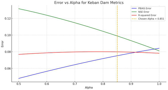 This graph illustrates the process of determining the optimal value of the parameter alpha (α) for the Keban Dam, based on minimizing different error metrics. The vertical axis represents the error values, while the horizontal axis shows the range of alpha values considered. The blue line corresponds to the PBIAS (Percent Bias) error, the red line represents the NSE (Nash–Sutcliffe Efficiency) error, and the green line depicts the R2 error. The vertical dashed line highlights the chosen optimal alpha value of 0.851, which appears to minimize the overall errors across the different metrics for the Keban Dam.