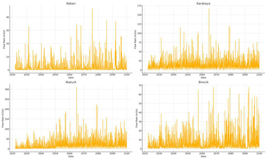 Keban, Karakaya, Ataturk, and Birecik Dams’ streamflow releases from 2024 to 2100 are shown in Figure 7. The graphs present the enhanced performance metrics for each dam following the adjustment of the α parameter. A general increase in R2 values across the board was observed, signifying a substantial improvement in model accuracy and predictive power.