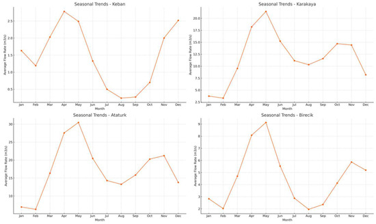 In Figure 8, the plots show significant seasonal variability in water releases. For example, Keban and Karakaya exhibit peak releases around spring and early summer, likely due to snowmelt and rainfall patterns, whereas Ataturk and Birecik show more moderated fluctuations, suggesting different water management strategies or basin characteristics.