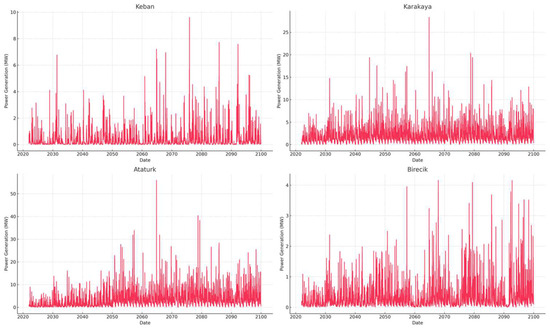 Figure 9 showcases the hydropower generation trends indicating growth and decline phases and reflecting operational and environmental changes. Notably, Karakaya shows a sharp increase in production capacity towards the later years, suggesting possible upgrades or increased water availability, whereas Ataturk demonstrates more consistent output, indicating stable conditions and efficient management.