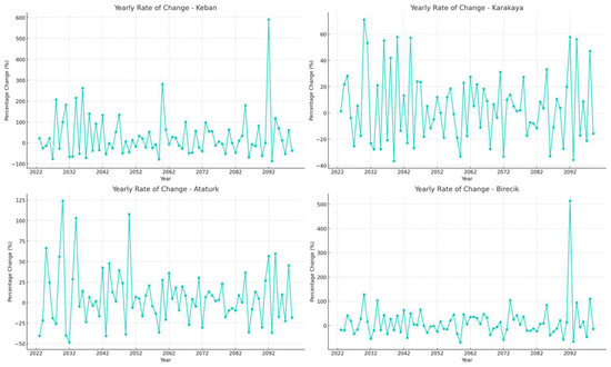 In Figure 10, the hydropower generation rate of change for the near future is shown. In general, annual changes in hydropower generation reveal operational challenges and successes. For instance, it can be observed from Figure 10 that Karakaya dam experiences significant fluctuations in hydropower generation, suggesting possible volatility in water inputs or mechanical issues.