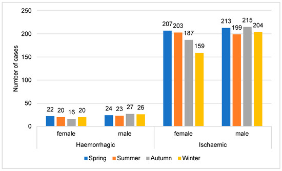 Between 1 January 2018 and 31 December 2019, during the 730 days examined, a total of 1765 cases were treated in Baranya County, of whom 834 were women (47.25%) and 931 were men (52.75%). Among the sample, 89.92% of the patients were hospitalized for ischemic stroke and 10.08% for hemorrhagic stroke. Overall, ischemic strokes were much more frequent, with males experiencing slightly higher frequencies. Seasonal variation was more pronounced in ischemic strokes, with the highest number of cases occurring in spring (n = 420) and the lowest in winter (n = 363) (Figure 1).