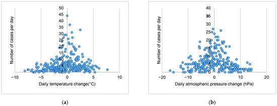 The relationship of (a) daily temperature variation and (b) air pressure with the total number of cases per day.