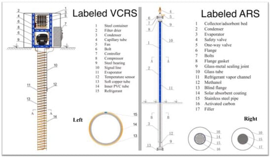 Permafrost Cooling and Solar Refrigeration. Cooling permafrost should be at the forefront of considered solutions for the U.S. military. Available datasets from the permafrost-dominated Qinghai—Tibet and Qinghai–Kangding highways show that passive measures, such as increasing the height of infrastructure, only decelerate permafrost thawing but fail to fully prevent it [55]. The first method to counteract the implications of thawing permafrost is to stabilize its temperature. One existing concept is to make incoming sun rays cool down the soil, rather than heating it and contributing to permafrost thaw [56]. This theory opts for photovoltaics, or other similar technologies, which convert solar radiation directly into electricity whilst simultaneously safeguarding the underlying soil. Implemented in warm summer months, this solar energy would then be used to cool the soil using either vapor compression refrigeration systems (VCRS) or absorption refrigeration systems (ARS) (Figure 3), each having their respective benefits [57]. VCRS has low electricity consumption, economical refrigeration capabilities, and reaches temperatures much cooler than that of permafrost. ARS has a refrigeration temperature under 0 °C, an uncomplicated structure, and fares well against seismic activity. In an analysis of VCRS throughout 15-day-night cycles and ARS throughout 3 days, refrigeration temperatures reached −23.55 °C and −1.83 °C, respectively, during the warm seasons, which is more than low enough to maintain existing permafrost tables. Projections estimate that an implementation of this model at the Baikal-Amur railroad would decrease thawing from 4.0 m to 1.51 m in 5 years [56]. In a field test of VCRS, the most optimal configuration was determined by varying cooling power, cooling time, the distance between the compression systems, and the buried depth of the evaporation section of the VCRS, which is where heat is absorbed and transformed into low-pressure vapor [58]. Thus, a design using 200 W of cooling power, 12 h of cooling time, a 6 m separation distance between systems, and a 5 m depth of the evaporation section decreased permafrost temperature and moved the permafrost table up 1.5 m after 30 years.