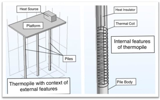Although the minimum temperatures beside the ATS (−13.3 °C to −14.2 °C) were lower than beside STS (below 0 °C), STS in tandem with snow reduction cones, devices that significantly increase cooling effects, is a cost effective, reliable, and versatile solution compared to ATS. Thermopiles, a combination of thermosiphons and piles (Figure 5) [47], maintain permafrost tables in cases with larger loads and greater threat of foundation movement [62]. During winter, when the atmosphere is colder than the ground, fluid from inlaid cooling devices circulates between an evaporator and condenser, enabling naturally occurring heat transfer [63]. However, when the disparity between ground and atmospheric temperatures falls below a threshold during the summer, the convection process does not occur. In a simulation, thermal coils, placed at varying distances within the piles, were supplied with a slightly negative refrigerant-supplied coolant [64]. This orientation, with carbon dioxide as the safest coolant, reduced the temperature of surrounding soil much more than standard piles and lowered the extent of thaw by 50% [63].