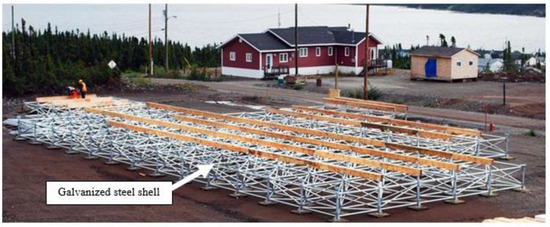 Materials used in the construction of the foundation have several implications for the maintenance of existing permafrost conditions. For example, wood is often a suggested choice (Figure 7) not only because it is lightweight and easy to transport, but also because it is environmentally friendly compared to alternative options [50]. Wood also possesses a minuscule coefficient of thermal conductivity, which means that less heat is transferred from the above infrastructure to the underlying permafrost it is built upon, decreasing thaw. The use of other materials, such as reinforced concrete or metals, is discouraged as they heighten heat conduction worsening permafrost conditions, are harder to transport due to being heavier, and cannot be constructed year-round as there is a lack of availability on how seasons will impact them. Materials for road pavement foundations have also been studied. Modular pavements, made of composites or rubber granules, are encouraged for being easy to transport and install, sustaining heavy loads, and their flexible nature means they are resilient against the thaw of underlying soil [71]. Alternatively, constructing a foundation of locally sourced materials and concrete covering treated with a binding adhesive would be economical and structurally sound.