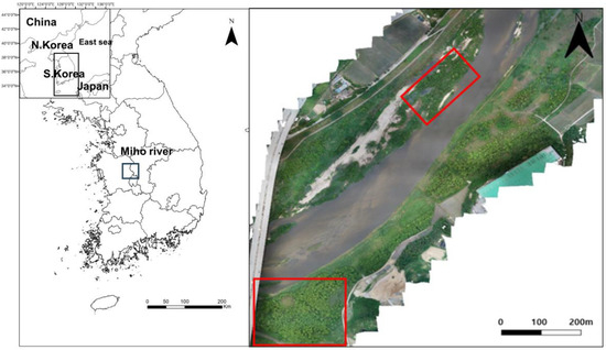 The Miho River belongs to the tributary of the Geum River. Its length is 89.2 km, and the watershed area is 1860.9 km2. The mean annual temperature of this area is 10.8 to 13.1 °C, and the mean annual precipitation is 1200 to 1400 mm (Figure 3). The riparian vegetation in the reach where this study was conducted is dominated by Salix pierotii Miq.
