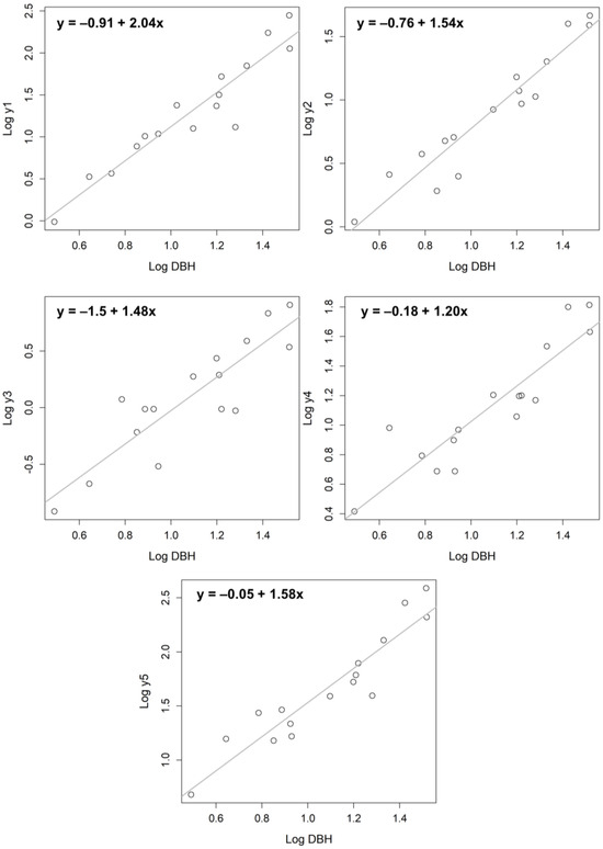 The allometric equations derived from the correlation between the diameter at breast height (DBH) and the dry weight of stems, branches, leaves, roots, and the total dry weight of each organ. The circles are observed data. y1 = stem; y2 = branch; y3 = leaf; y4 = root; y5 = total biomass.