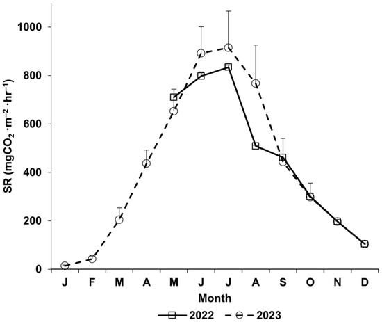 Seasonal variation in monthly mean soil respiration of S. pierotii community established along Miho River. Bars indicate standard errors of mean soil respiration.