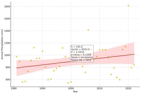 This study analyzed rainfall data for the period 1981–2022. It was found that Maasai Mara received an average of 901.08 mm a year. This large amount of rainfall posed several challenges to the game reserve. The trend showed that the average total rainfall increased over time. However, this increase was not statistically significant (Figure 3). This was in contrast to other parts of Africa, where there were concerns about a general decline in the annual average rainfall in protected areas [67]. There was evidence of extremely high rainfall events in some years and not in others. The year 2020 was one of the wettest years on record.