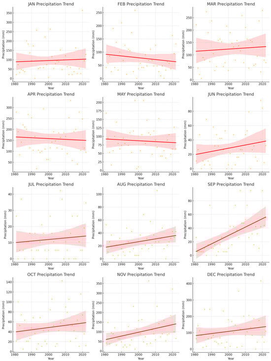 Monthly data analysis also revealed that rainfall patterns varied monthly (Figure 4 and Figure 5). On average, there were slight declines in the rainfall in February and May. This could indicate seasonal pattern changes during these months.