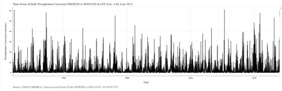 Time series analysis of daily precipitation for Maasai Mara corrected from 1982 to 2023.