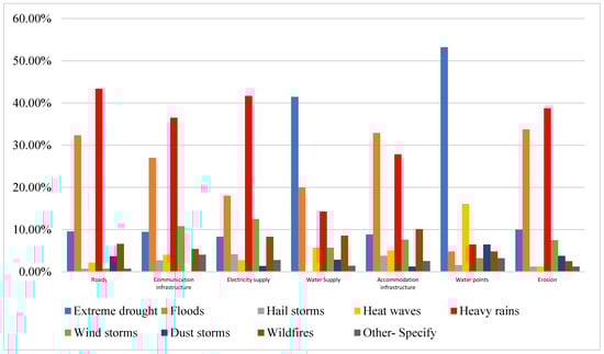 In light of observations on the impact of intense rainfall in the game, the survey respondents equally observed hydrometeorological events of this nature that were particularly damaging to road infrastructure (Figure 8). Intense rainfall was also flagged as the game reserve’s leading cause of loss and damage to roads, communication infrastructure, and electricity supply and one of the leading causes of soil loss due to erosion. Given that the roads in the game reserve were out of gravel, they were often washed away after floods. Moreover, intense rainfall activity also disrupted the power supply and communication network in and between the reserve. Given that the accommodation infrastructure comprised semi-permanent structures in the form of tents, these structures were highly susceptible to damage during intense rainfall activity that often occurred in the area, as seen from earlier presentations of climate data. This was confirmed through field observations. Building infrastructure that could withstand the harsh realities of the Maasai Mara is critical. There is a need to revise infrastructure-building codes to consider extreme weather events to ensure climate adaptation and resistance. This would minimize the associated losses from hydrometeorological events, such as intense rainfall activity, which is increasingly common in that area.