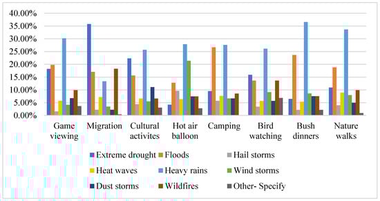Tourist activities in the MMNR were affected by extreme weather events other than heavy rains and floods, as indicated in Figure 8. Wildebeest and other species migration, representing the signature brand activity for the MMGR, was affected by extreme drought followed by wildfires. This sometimes resulted in a delay in the annual wildlife crossing the Mara River, which was the main pull factor for tourists visiting MMNR from July to September. Since most migration-based packages were pre-booked, delays in the actual crossing prevented guests from seeing the iconic scene, leaving them unsatisfied. These impacts on tourist activities were similar to the findings of Coldrey and Turpie [69]. The findings also revealed that cultural tours and activities were affected by extreme drought, which caused pastoral communities to migrate in search of water and pastures for their animals. Hot air ballooning was most affected by windstorms.