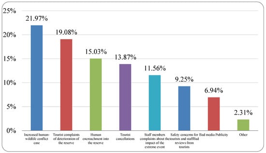 In addition to the environmental impacts, the study revealed some socio-economic impacts of extreme weather events, as shown in Figure 10. The leading effect was increased incidents of human–wildlife conflicts. The interviews revealed that lions, elephants, and buffalo were the main perpetrators of these conflicts. These findings were consistent with those of Abrahms et al. [70]. Tourist complaints about the deteriorating experience of the MMNR, human encroachment into the protected area, and tourist cancellations followed. In descending order, other impacts included staff complaints about the impacts of extreme events, safety concerns, and bad publicity.