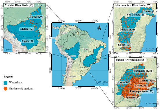 Daily rainfall data registered between 1980 and 2022 from 1898 pluviometric stations of the National Water and Basic Sanitation Agency (ANA; https://www.snirh.gov.br/hidroweb/serieshistoricas, accessed on 10 June 2024) and located in the MRB, PRB, and SFRB were used in this study (Figure 1). However, only sites with at least 7300 days of valid observations (approximately 20 years of data) were considered. ANA data were classified according to consistency: level 1 included pre-analyzed data, used in this study, while level 2 comprised raw data.