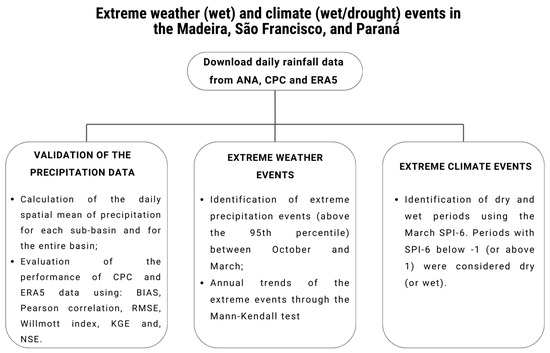 In this study, an analysis of extreme weather and climate precipitation events during the rainy season was conducted in the MRB, PRB, and SFRB, which belong to the SAMS region. Additionally, the performance of CPC and ERA5 data in identifying the occurrence of these events was evaluated. Statistical analysis of the daily data revealed that the CPC set performed better in all basins analyzed.