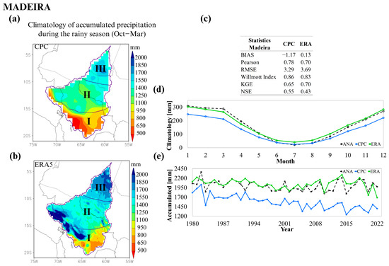 Analysis for the MRB: climatology of accumulated precipitation for the rainy season (October to March) for (a) CPC and (b) ERA5; (c) statistical analysis based on daily data; (d) monthly climatology; and (e) annual accumulation. In (d,e), the ERA5 database is indicated in green, the CPC is indicated in blue, and the observations are shown in black. Regions I, II and III indicate the Upper, Middle and Lower Madeira regions, respectively.