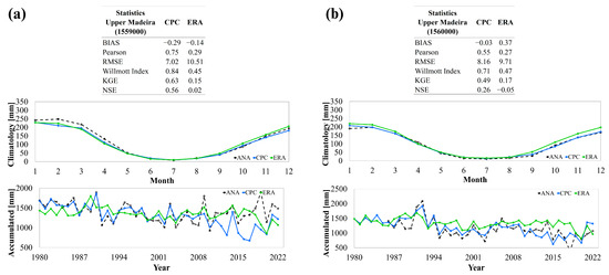 Statistical analysis based on daily data, monthly climatology, and annual accumulation for 2 stations in Upper Madeira: (a) 1559000 and (b) 1560000. The ERA5 database is indicated in green, the CPC is indicated in blue, and the observations are shown in black.