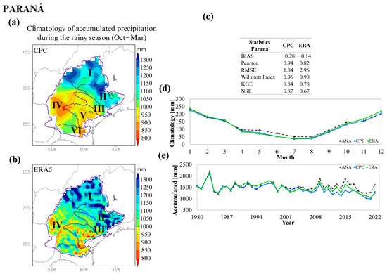 Analysis for the PRB: climatology of accumulated precipitation for the rainy season (October to March) for (a) CPC and (b) ERA5; (c) statistical analysis based on daily data; (d) monthly climatology; and (e) annual accumulation. In (d,e), the ERA5 database is indicated in green, the CPC is indicated in blue, and the observations are shown in black. Regions I, II, III, IV, V, and VI indicate the Paranaíba, Grande, Tietê, Paraná, Paranapanema, and Iguaçu regions.