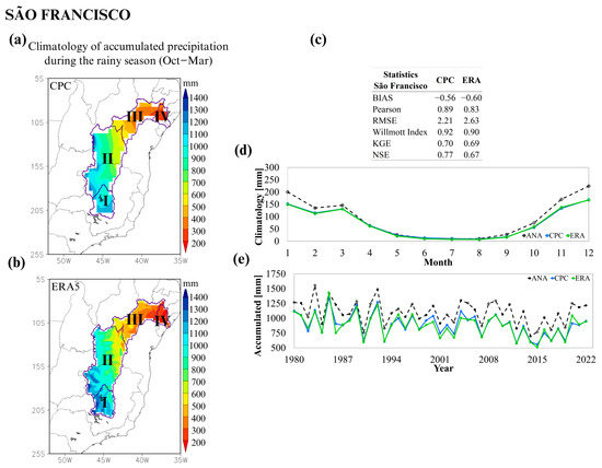 Analysis for the SFRB: climatology of accumulated precipitation for the rainy season (October to March) for (a) CPC and (b) ERA5; (c) statistical analysis based on daily data; (d) monthly climatology; and (e) annual accumulation. In (d,e), the ERA5 database is indicated in green, the CPC is indicated in blue, and the observations are shown in black. Regions I, II, III, and IV indicate the Upper, Middle, Sub-Middle, and Lower São Francisco regions.