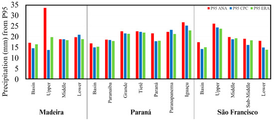 P95 values (precipitation in mm) identified by the ANA, CPC, and ERA5 datasets considering the average in the basins and for each of the subregions. The ERA5 database is indicated in green, the CPC in blue and the observations are shown in red.