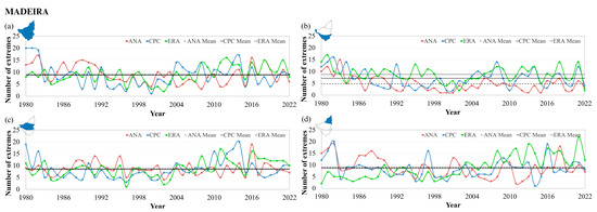 Number of days with extreme precipitation higher than P95 identified by the ANA, CPC, and ERA5 datasets in the MRB regions between 1980 and 2022: (a) entire basin; (b) Upper; (c) Middle; and (d) Lower. In some figures, the means of the datasets are quite close, which causes the black line representing the average to appear as a single line. The ERA5 database is indicated in green, the CPC is indicated in blue, and the observations are shown in red.