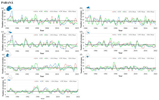Number of days with extreme precipitation higher than P95 identified by the ANA, CPC, and ERA5 datasets in the PRB regions between 1980 and 2022: (a) entire basin; (b) Paranaíba; (c) Grande; (d) Tietê; (e) Paraná; (f) Paranapanema; (g) and Iguaçu. In some figures, the means of the datasets are quite close, which causes the black line representing the average to appear as a single line. The ERA5 database is indicated in green, the CPC is indicated in blue, and the observations are shown in red.