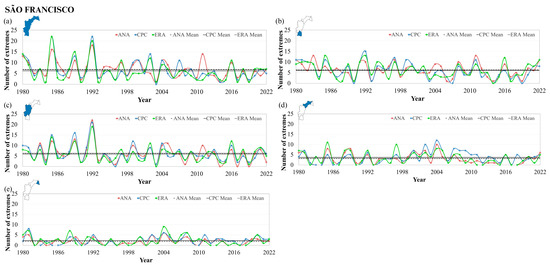 Number of days with extreme precipitation higher than P95 identified by the ANA, CPC, and ERA5 datasets in the SFRB regions between 1980 and 2022: (a) entire basin; (b) Upper; (c) Middle; (d) Sub-Middle; and (e) Lower. In some figures, the means of the datasets are quite close, which causes the black line representing the average to appear as a single line. The ERA5 database is indicated in green, the CPC is indicated in blue, and the observations are shown in red.
