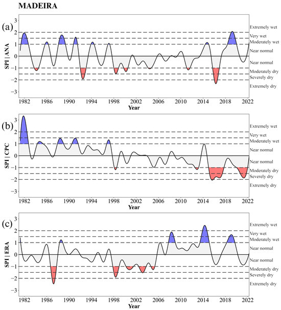 Climate-related extreme wet and drought events were identified using the SPI-6 from March, which stored the information regarding the extended rainy season. The results revealed a shift in the patterns of occurrence of extreme events across the basin, evident in both datasets (Figure 11). Above-average rainfall events have become less frequent, while drought events have become increasingly common. In the MRB, ANA recorded seven drought episodes and eight wet episodes (Figure 11a). The CPC, in turn, captured six droughts and six wet events, while ERA5 identified six droughts and only five wet periods (Figure 11b,c). Some of the wetter events recorded by ANA are associated with flood years in Porto Velho, a municipality belonging to the MRB, such as 1982, 1984, 1988 and 1997 [78], and these events were more effectively captured by the CPC data (Figure 11b). The year 2014 stands out as a period of unprecedented flooding in both the Brazilian and Peruvian parts of the basin, which was reflected in the wet conditions observed in the SPI, especially in ERA5 (Figure 11c) [79]. Regarding drought episodes, the literature highlights the years 2005, 2010, 2016, 2020, and 2022 [9,80,81]. The year 2005 was identified as dry by ANA and ERA5, but not by CPC. However, the droughts of 2016, 2020, and 2022 were effectively captured by CPC. The year 2010 was not captured by any dataset, corroborating the observations of Molina-Carpio et al. [82], who also did not identify this period as dry. In general, the ANA and CPC datasets show a similar variation pattern, with more wet episodes at the beginning of the series and more dry episodes at the end. However, ERA5 exhibits an inverse behavior, with an increase in wet events in more recent years.
