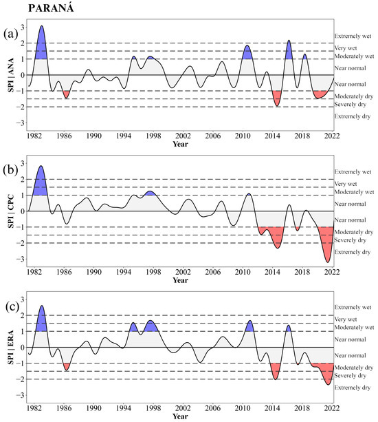 In the case of the PRB, four dry periods and eight wet periods were identified using SPI-6 calculated with ANA data (Figure 12a). Using CPC data, seven dry and five wet episodes were identified, while ERA5 indicated six dry and seven wet periods (Figure 12b,c). In general, the wettest periods occurred at the beginning of the series of all datasets, coinciding with several flood episodes in the basin, mainly between 1983/1984 and during the 1990s [83,84]. The SPI-6 results indicate that the most recent years have been drier in the basin, which is in line with previous findings in the literature [12,85]. Overall, both datasets present consistent SPI results, demonstrating similar behavior throughout the analyzed period.
