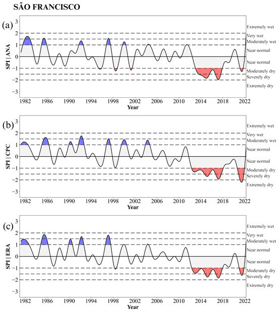 In total, the SPI-6 data from ANA indicate the occurrence of eight dry and seven wet episodes in the SFRB (Figure 13a). The CPC identified six dry and nine wet periods, while ERA5 showed six dry and eight wet periods (Figure 13b,c). As in the PRB, the wettest periods in the SFRB were recorded early in the series in both datasets, coinciding with flood episodes in the basin, such as in 1983, 1992, and 2004 [84,86]. Since 2013, the SFRB has experienced prolonged periods of below-average precipitation, as indicated by the SPI-6 of the analyzed databases, which is in line with reports in the literature [11,76]. Overall, the CPC and ERA5 data effectively identified the behavior of the SPI-6 series in the SFRB during the period from 1980 to 2022.