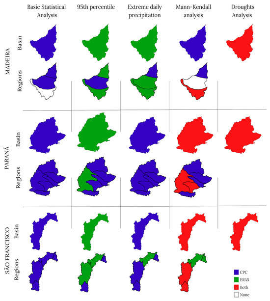 Figure 14 summarizes all analyses performed, indicating which dataset performed best. Overall, the CPC data presented the best statistical results for all basins. Regarding extreme precipitation events, although ERA5 performed better in percentage values, the CPC data identified precipitation extremes better, except for the MRB. For the analysis of drought events and Mann–Kendall trends, both datasets performed well. The lack of meteorological stations in the Upper Madeira region may have negatively influenced the results of the comparison between the datasets. Overall, both datasets performed well, indicating that they can be considered in the absence of station data. It is important to note the differences in the spatial resolutions of the data, with the CPC having a resolution of 0.5°, while ERA5 has a finer resolution of 0.25°. Furthermore, it is also worth mentioning some limitations of this study, in addition to highlighting the difficulties faced by Latin American researchers, which are mainly associated with the low density of meteorological stations, the quality of the data, which often presents inconsistencies and precision limitations, and the use of interpolation techniques to fill areas with little station coverage, which can result in information that does not always accurately represent real conditions [20].