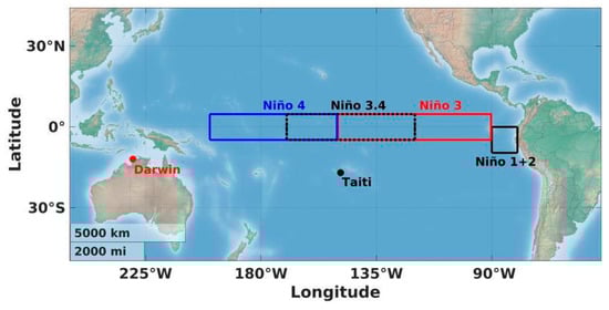 Four regions within the CTPO were considered, denoted as Niño 1+2 (80° W–90° W), 3 (90° W–150° W), 3.4 (120° W–170° W), and 4 (150° W–160° E). The Niño 3.4 region is monitored using an index referred to as the Oceanic Niño Index (ONI). Figure 1 illustrates the geographic delineation of the analyzed regions and the SSTA within each Niño region. Oceanic data for monthly anomalies are derived from the Extended Reconstructed Sea Surface Temperature Version 5 (ERSSTV5) dataset, sourced from in situ observations provided by the Physical Sciences Laboratory (PSL) of NOAA (https://psl.noaa.gov/data/climateindices/list/, accessed on 9 April 2023).