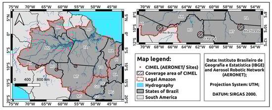 Location of the Legal Amazon for spatial evaluation of EAOD-BC and the sites of AERONET in Alta Floresta (state of Mato Grosso, MT), Ji-Paraná (state of Rondônia, RO), and Rio Branco (state of Acre, AC), over which AOD and EAOD-BC data were analyzed, with the location of the CIMEL solar photometer and its coverage area with a radius of 50 km. The Legal Amazon comprises the states of Acre (AC), Amapá (AP), Amazonas (AM), Maranhão (MA), Mato Grosso (MT), Pará (PA), Rondônia (RO), Roraima (RR), and Tocantins (TO).